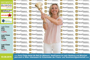 3.8.: Karin Fitzka läutet die Opening Bell für Mittwoch. NewFinance ist nach Hamburg und München jetzt auch in Wien tätig. Interessant für Entscheider der Finanz- und Versicherungswirtschaft http: newfinance.at 2.8. : Die W.E.B-Chefs Frank Dumeier und Michael Trcka läuten die Opening Bell für Dienstag und gleichzeitig das "Green Power Anleihen"-Trio für 2016 ein. Zeichnungsstart jetzt http: www.windenergie.at 1.8.: Peter Bosek läutet die Opening Bell für Montag. Der Erste Group Vorstand freut sich, dass die EU-weiten Stresstest-Ergebnisse für die Erste stressfrei ausgefallen sind www.erstegroup.com 29.7. : Stefan Zapotocky läutet die Opening Bell für Freitag. Der Börsevorstand der goldenen ATX-Ära verst&au... » Weiterlesen
