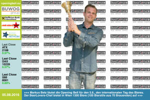 5.8.: Markus Betz läutet die Opening Bell für den 5.8., den internationalen Tag des Bieres. Der BeerLovers-Chef bietet in Wien 1300 Biere (100 Bierstile aus 70 Brauereien) auf. Workshops gibt es hier: http: beerlovers.at Events 4.8.: Diana Neumüller-Klein , Kommunikations-Chefin der Strabag, läutet die Opening Bell für Donnerstag. Die Strabag-Aktie ist mit ca. 20% ytd-Plus in den ATXPrime-Top-Drei 2016 http: www.strabag.com 3.8.: Karin Fitzka läutet die Opening Bell für Mittwoch. NewFinance ist nach Hamburg und München jetzt auch in Wien tätig. Interessant für Entscheider der Finanz- und Versicherungswirtschaft http: newfinance.at 2.8. : Die W.E.B-Chefs Frank Dumeier und Michael Trcka läuten die Opening Bell für Diensta... » Weiterlesen