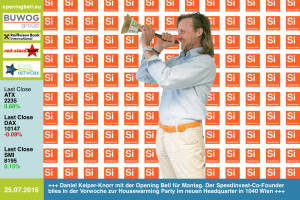 25.7 .: Daniel Keiper-Knorr mit der Opening Bell für Montag. Der Speedinvest-Co-Founder blies in der Vorwoche zur Housewarming Party im neuen Headquarter in 1040 Wien http: speedinvest.com 22.7. : Lukas Jersabek läutet die Opening Bell für Freitag. Der Obmann der "Alsergrund Runplugged Runners" verweist auf den 10. Krebsforschungslauf am 8.10. im Alten AKH http: www.runplugged.com initiative-krebsforschung.meduniwien.ac.at krebsforschungslauf 21.7. : Alexandra Rosinger, Director Strategic Research & Corporate Finance Rosinger Group, läutet die Opening Bell für Donnerstag. Mit dem BSN ist ein 3-sprachiges Fach-PDF in Vorbereitung http: www.photaq.com page index 2635 http: www.rosinger-group.com 20.7. : Michaela Ellen Lenz läutet die Opening Bell... » Weiterlesen
