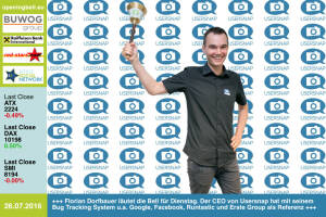 27.7. : Hannes Roither mit der Opening Bell für Mittwoch. Der Palfinger-Kommunikator tritt als aktivster Roadshow- Messepresenter in die Hall of Fame des österreichischen Kapitalmarkts (Class of 2016) ein http: www.boerse-social.com hall-of-fame Heute vor Marktstart wurden zudem gute Quartalszahlen geliefert http: www.palfinger.com 26.7. : Florian Dorfbauer läutet die Opening Bell für Dienstag. Der CEO von Usersnap hat mit seinem Bug Tracking System u.a. Google, Facebook, Runtastic und Erste Group als Referenz http: www.usersnap.com 25.7 .: Daniel Keiper-Knorr mit der Opening Bell für Montag. Der Speedinvest-Co-Founder blies in der Vorwoche zur Housewarming Party im neuen Headquarter in 1040 Wien http: speedinvest.com 22.7. : Lukas Jersabek läutet die... » Weiterlesen