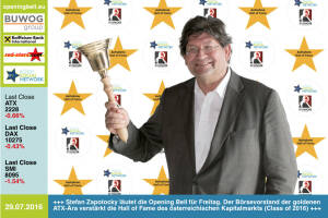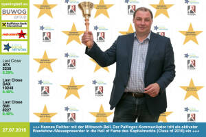 29.7. : Stefan Zapotocky läutet die Opening Bell für Freitag. Der Börsevorstand der goldenen ATX-Ära verstärkt die Hall of Fame des österreichischen Kapitalmarkts (Class of 2016) http: www.boerse-social.com hall-of-fame 28.7. : das 361focus-Team Roman Sindelar , Alex Vogel , Mastermind Philip Rusch , Claus Westermayer und Ulrike Mülleder läutet die Bell für Donnerstag. Für „Best of Austria“ fotografiert Rusch am 29.11. das grösste 360° Panoramafoto der Welt in Wien. Weitere Bilder: http: www.photaq.com page index 2645 http: www.361focus.com Background: http: www.krone.at digital best-of-austria-panorama-mit-10000-menschen-gigapixel-portraet-story-521861 - mit dem BSN sind wir Partner 27.7. : Hannes Roither mi... » Weiterlesen