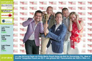 28.7. : das 361focus-Team Roman Sindelar , Alex Vogel , Mastermind Philip Rusch , Claus Westermayer und Ulrike Mülleder läutet die Bell für Donnerstag. Für „Best of Austria“ fotografiert Rusch am 29.11. das grösste 360° Panoramafoto der Welt in Wien. Weitere Bilder: http: www.photaq.com page index 2645 http: www.361focus.com Background: http: www.krone.at digital best-of-austria-panorama-mit-10000-menschen-gigapixel-portraet-story-521861 - mit dem BSN sind wir Partner 27.7. : Hannes Roither mit der Opening Bell für Mittwoch. Der Palfinger-Kommunikator tritt als aktivster Roadshow- Messepresenter in die Hall of Fame des österreichischen Kapitalmarkts (Class of 2016) ein http: www.boerse-social.com hall-of-fame Heute vor Marktstart wur... » Weiterlesen