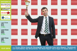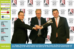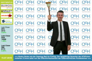 15.7.: Bosko Skoko mit der Opening Bell für Freitag. Der langjährige Sprecher der ATXPrime-notierten S Immo leitet nun die Öffentlichkeitsarbeit der Österreichischen Ärztekammer http: www.aerztekammer.at 14.7.: Gregor Rosinger , Dietrich Bock und Eduard Berger läuten die Opening Bell für Donnerstag und einen Neuling an der Wiener Börse: Die Aktie der Dr. Bock Industries AG startet heute http: www.openingbell.eu 13.7.: Prost: Barbara Stambolija , Portfoliomanager Georg Zenker und Promogirl Anna läuten die Opening Bell für Mittwoch und den Global Beer Fund, der in Bier-Aktien investiert http: www.investier-in-bier.at 12.7.: Florian Söllner läutet die Opening Bell für Dienstag. Als leitender Autor beim Magazin "De... » Weiterlesen