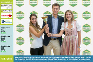 13.7.: Prost: Barbara Stambolija , Portfoliomanager Georg Zenker und Promogirl Anna läuten die Opening Bell für Mittwoch und den Global Beer Fund, der in Bier-Aktien investiert http: www.investier-in-bier.at 12.7.: Florian Söllner läutet die Opening Bell für Dienstag. Als leitender Autor beim Magazin "DerAktionär" und Chefredakteur des Börsenbriefs "Hot Stock Report" hat er ein Gspür für heisse Aktien http: www.deraktionaer.de www.hotstockreport.de 11.7.: Neo-Trainer Mike Büskens und Stimme Andy Marek läuten die Opening Bell für Montag. Das neue Allianz Stadion von Rapid Wien startet mit einem VIP-Opening für ca. 1500 Gäste - Bilder hier http: www.photaq.com page index 2618 http: www.skrapid.at 8.7. : Katha... » Weiterlesen