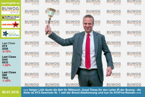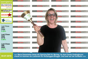 6.7: Holger Lüth läutet die Opening Bell für Mittwoch. Good Times für den Leiter IR der Buwog - die Aktie ist ATX-Gewinner Nr. 1 seit der Brexit-Abstimmung und nun im ATXFive-Rennen http: www.buwog.at 5.7: Nina Bergmann mit der Opening Bell für Dienstag. Die finanzen.at-Managerin (Springer Verlag) ist Partnerin und Jurymitglied beim Finanzblogger-Award "Smeil". Heute Abend gibt es die Sieger 2016 http: www.smeil-award.com 4.7: Maria Petzwinkler läutet die Opening Bell für Montag. Ihr Kart Center Kottingbrunn checkt im Sommer ein Laufevent für Runplugged-Blogger. Und zwar auf der Kartbahn, siehe http: www.photaq.com page index 2601 bzw. http: www.kartcenter.at http: www.runplugged.com 1.7: Staatssekretär Harald Mahrer läutet... » Weiterlesen
