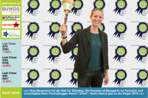 5.7: Nina Bergmann mit der Opening Bell für Dienstag. Die finanzen.at-Managerin (Springer Verlag) ist Partnerin und Jurymitglied beim Finanzblogger-Award "Smeil". Heute Abend gibt es die Sieger 2016 http: www.smeil-award.com 4.7: Maria Petzwinkler läutet die Opening Bell für Montag. Ihr Kart Center Kottingbrunn checkt im Sommer ein Laufevent für Runplugged-Blogger. Und zwar auf der Kartbahn, siehe http: www.photaq.com page index 2601 bzw. http: www.kartcenter.at http: www.runplugged.com 1.7: Staatssekretär Harald Mahrer läutet eine optimistische Opening Bell für das 2. Halbjahr: Gestern präsentierte er mit Partnern das grosse Potenzial für die Errichtung einer neuen KMU-Börse in Österreich. Bilder zum Event: http: www.photaq... » Weiterlesen