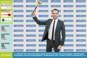 7.7: Michael Berl läutet die Opening Bell für Donnerstag. Das Fachmagazin "DerBörsianer" bringt News und die Onlineplattform "DerBörsianer.com" Insides für die Finanzbranche http: www.derboersianer.com 6.7: Holger Lüth läutet die Opening Bell für Mittwoch. Good Times für den Leiter IR der Buwog - die Aktie ist ATX-Gewinner Nr. 1 seit der Brexit-Abstimmung und nun im ATXFive-Rennen http: www.buwog.at 5.7: Nina Bergmann mit der Opening Bell für Dienstag. Die finanzen.at-Managerin (Springer Verlag) ist Partnerin und Jurymitglied beim Finanzblogger-Award "Smeil". Heute Abend gibt es die Sieger 2016 http: www.smeil-award.com 4.7: Maria Petzwinkler läutet die Opening Bell für Montag. Ihr Kart Center Kottingbrunn checkt im Som... » Weiterlesen