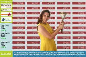 8.7. : Katharina Braun läutet die Opening Bell für Freitag. Die Rechtsanwältin (u.a. Scheidungen) mit Medien Know-How (ORF, DiePresse) schätzt den Aktien- wie auch den Beziehungsmarkt volatil ein http: www.rechtsanwaeltin-braun.at 7.7: Michael Berl läutet die Opening Bell für Donnerstag. Das Fachmagazin "DerBörsianer" bringt News und die Onlineplattform "DerBörsianer.com" Insides für die Finanzbranche http: www.derboersianer.com 6.7: Holger Lüth läutet die Opening Bell für Mittwoch. Good Times für den Leiter IR der Buwog - die Aktie ist ATX-Gewinner Nr. 1 seit der Brexit-Abstimmung und nun im ATXFive-Rennen http: www.buwog.at 5.7: Nina Bergmann mit der Opening Bell für Dienstag. Die finanzen.at-Managerin (Sprin... » Weiterlesen