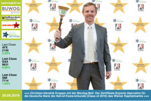 20.6 : Christian-Hendrik Knappe mit der Openinge Bell für Montag. Der Zertifikate-Experte (X-markets) übernahm stv. für die Deutsche Bank die Hall-of-Fame-Urkunde (Class of 2016) des österreichischen Kapitalmarkts http: www.boerse-social.com hall-of-fame 17.6: Asset Manager Wolfgang Matejka läutet die Opening Bell für Freitag anlässlich seiner Aufnahme in die Class of 2016 der Hall of Fame des österreichischen Kapitalmarkts http: www.boerse-social.com hall-of-fame http: www.mp-am.com 16.6: Petra Götz-Frisch mit der Opening Bell für Donnerstag. Die Ex-Sprecherin der börsenotierten S&T feiert dieser Tage 6 Monate http. www.goldfisch.wien mit Produkten aus Meer, See und Fluss 15.6: Werner Böhm mit der Opening Bell f&uu... » Weiterlesen