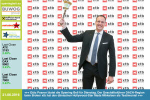 21.6: Götz Posner läutet die Opening Bell für Dienstag. Der Geschäftsführer DACH-Region beim Broker xtb hat den dänischen Hollywood-Star Mads Mikkelsen als Testimonial http: www.xtb.com de http: www.openingbell.eu 20.6 : Christian-Hendrik Knappe mit der Openinge Bell für Montag. Der Zertifikate-Experte (X-markets) übernahm stv. für die Deutsche Bank die Hall-of-Fame-Urkunde (Class of 2016) des österreichischen Kapitalmarkts http: www.boerse-social.com hall-of-fame 17.6: Asset Manager Wolfgang Matejka läutet die Opening Bell für Freitag anlässlich seiner Aufnahme in die Class of 2016 der Hall of Fame des österreichischen Kapitalmarkts http: www.boerse-social.com hall-of-fame http: www.mp-am.com 16.6: Petra G&ou... » Weiterlesen