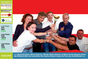 22.6: Deutsche Bank, Börse Express, Börsen Radio Network & Börse Social Network läuten die Opening Bell für Mittwochl und wünschen dem Österreichischen Nationalteamheute die Tore zum Achtelfinale der EM http: www.openingbell.eu 21.6: Götz Posner läutet die Opening Bell für Dienstag. Der Geschäftsführer DACH-Region beim Broker xtb hat den dänischen Hollywood-Star Mads Mikkelsen als Testimonial http: www.xtb.com de http: www.openingbell.eu 20.6 : Christian-Hendrik Knappe mit der Openinge Bell für Montag. Der Zertifikate-Experte (X-markets) übernahm stv. für die Deutsche Bank die Hall-of-Fame-Urkunde (Class of 2016) des österreichischen Kapitalmarkts http: www.boerse-social.com hall-of-fame 17.6: Asse... » Weiterlesen