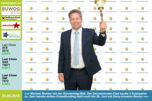 23.6 : Michael Richter mit der Opening Bell für Donnerstag. Der Sonneninvest-Chef kaufte 2 Solarparks zu. Sein bereits drittes Crowdfunding läuft noch bis 28. Juni mit Early-Investor-Bonus www.econeers.de sonneninvest3 22.6: Deutsche Bank, Börse Express, Börsen Radio Network & Börse Social Network läuten die Opening Bell für Mittwochl und wünschen dem Österreichischen Nationalteamheute die Tore zum Achtelfinale der EM http: www.openingbell.eu 21.6: Götz Posner läutet die Opening Bell für Dienstag. Der Geschäftsführer DACH-Region beim Broker xtb hat den dänischen Hollywood-Star Mads Mikkelsen als Testimonial http: www.xtb.com de http: www.openingbell.eu 20.6 : Christian-Hendrik Knappe mit der Openinge Bell f&... » Weiterlesen