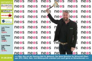 1.6. :Niko Alm läutet dieOpening Bell für Mittwoch. Der Neos-Sprecher für Wirtschaft (Start-ups, EPU, KMU), Netz- und Medienpolitik orientiert sich auch gerne an Börsenkursen. 31.5: Lukas Leys läutet die Opening Bell für Dienstag im Rahmen der UBM-Privatanleger-Invitation. Beruflich ist er ebenso analytisch: PE Real Estate und Mezzanine Finance http: www.ubm.at 30.5: Wiener Börse Vorstand Birgit Kuras läutet die Opening Bell für Montag anlässlich ihrer Aufnahme in die Class of 2016 der Hall of Fame des österreichischen Kapitalmarkts http: www.boerse-social.com hall-of-fame 27.5: Wiener Börse Vorstand Michael Buhl läutet die Opening Bell für Freitag anlässlich seiner Aufnahme in die Hall of Fame, Class of 2016,... » Weiterlesen