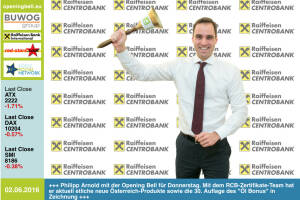 2.6: Philipp Arnold mit der Opening Bell für Donnerstag. Mit dem RCB-Zertifikate-Team hat er aktuell etliche neue Österreich-Produkte sowie die 30. Auflage des "Öl Bonus" in Zeichnung http: www.rcb.at 1.6. : Niko Alm läutet dieOpening Bell für Mittwoch. Der Neos-Sprecher für Wirtschaft (Start-ups, EPU, KMU), Netz- und Medienpolitik orientiert sich auch gerne an Börsenkursen. 31.5: Lukas Leys läutet die Opening Bell für Dienstag im Rahmen der UBM-Privatanleger-Invitation. Beruflich ist er ebenso analytisch: PE Real Estate und Mezzanine Finance http: www.ubm.at 30.5: Wiener Börse Vorstand Birgit Kuras läutet die Opening Bell für Montag anlässlich ihrer Aufnahme in die Class of 2016 der Hall of Fame des österreichisc... » Weiterlesen
