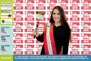 26.4: Manners Miss Bonbon mit der Opening Bell für Dienstag. Auch Produkte der börsenotierten Manner werden im Goodie-Bag des 1. BSN Finanzmarkttags sein, unter http: www.boerse-social.com roadshow ausgedruckte Einladung einlösen, vor Ort Foto und fertig http: www.manner.com 25.4.: Corrado de Gasperis läutet die Opening Bell für Montag. Der CEO von Comstock Mining ist auf dem Weg, das in Nevada tätige Unternehmen zum 100.000-Unzen-Producer zu machen http: comstockmining.com 22.4. : Elke Koch läutet die Opening Bell für Freitag. Die IR- & Kommunikations-Chefin vonAT&S eröffnete gestern das größte Einzelinvestment in China, das neue Werk in Chongqing, Bilder siehe http: www.photaq.com page index 2468 http: www.ats.net de... » Weiterlesen