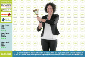 2.5: Elisabeth Wagerer läutet die Opening Bell für Montag. Mit Anfang Mai ist sie zum Head of Corporate Communications & Investor Relations der börsenotierten S Immo AG aufgestiegen http: www.simmoag.at 29.4: Gerhard Massenbauer mit der Opening Bell für Freitag. Mit censeo.at setzt der gefragte Speaker und Währungsexperte auf Wissensvorsprung in der Vermögensveranlagung http: www.censeo.at 28.4: Susanne Lederer-Pabst mit der Opening Bell für Donnerstag. Die 4-your-biz.com-Gründerin und beeideteund gerichtlich zertifizierte Sachverständige für das Bank– und Börsewesen sprach in der Wiener Börse über die Eigenvorsorge-Berichterstattung in österreichischen Medien http: www.4-your-biz.com 27.4: Greg Ferr... » Weiterlesen