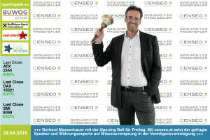 29.4: Gerhard Massenbauer mit der Opening Bell für Freitag. Mit censeo.at setzt der gefragte Speaker und Währungsexperte auf Wissensvorsprung in der Vermögensveranlagung http: www.censeo.at 28.4: Susanne Lederer-Pabst mit der Opening Bell für Donnerstag. Die 4-your-biz.com-Gründerin und beeideteund gerichtlich zertifizierte Sachverständige für das Bank– und Börsewesen sprach in der Wiener Börse über die Eigenvorsorge-Berichterstattung in österreichischen Medien http: www.4-your-biz.com 27.4: Greg Ferron , VP Corporate Development and IR bei Treasury Metals, läutet die Opening Bell für Mittwoch: Der Goldentwickler aus Ontario Kanada ist auf dem Weg in die Produktion http: www.treasurymetals.com 26.4: Manners Mis... » Weiterlesen