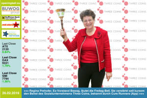 26.2: Regina Prehofer , Ex-Vorstand der Bawag, läutet die Opening Bell für Freitag. Sie verstärkt seit kurzem den Beirat des Sozialunternehmens Three Coins, bekannt durch die App "Cure Runners" http: www.threecoins.org 25.2: Marcus Handl, IR-Chef von Kapsch TrafficCom, mit der Opening Bell für Donnerstag. Der Börse-Wien-Top-Performer 2015 brachte gestern starke Zahlen für Q1-3 2015 16 http: www.kapsch.net ktc 24.2: Yvonne Rueff läutet die Opening Bell für Mittwoch. Die Obfrau von Dancer against Cancer und Tanzschulbesitzerin veranstaltet am 9.4. ihren Galaball im Zeichen gegen den Krebs http: danceragainstcancer.com http: www.tanzschulerueff.at 23.2 : Raiffeisen-ICS-Managerin Carola Bendl-Tschiedel mit der Opening Bell für Dienst... » Weiterlesen