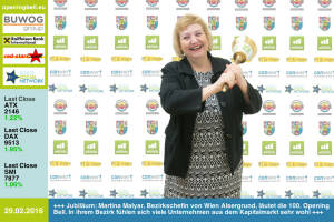 29.2: Jubiläum: Martina Malyar , SPÖ-Bezirksvorsteherin von Wien Alsergrund, läutet die 100. Opening Bell. In ihrem Bezirk fühlen sich viele Unternehmen aus dem Kapitalmarkt sehr wohl http: www.conwert.com http: www.wikifolio.com http: www.boerse-social.com http: www.runplugged.com http: www.openingbell.eu 26.2: Regina Prehofer , Ex-Vorstand der Bawag, läutet die Opening Bell für Freitag. Sie verstärkt seit kurzem den Beirat des Sozialunternehmens Three Coins, bekannt durch die App "Cure Runners" http: www.threecoins.org 25.2: Marcus Handl, IR-Chef von Kapsch TrafficCom, mit der Opening Bell für Donnerstag. Der Börse-Wien-Top-Performer 2015 brachte gestern starke Zahlen für Q1-3 2015 16 http: www.kapsch.net ktc 24.2: Yvo... » Weiterlesen