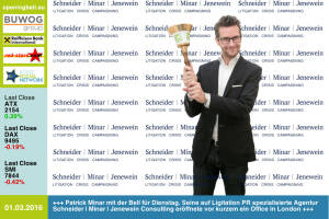 1.3: Patrick Minar mit der Opening Bell für Dienstag. Seine auf Ligitation PR spezialisierte Agentur Schneider | Minar | Jenewein Consulting eröffnete vor kurzem ein Office in London http: www.smj.at 29.2: Jubiläum: Martina Malyar , SPÖ-Bezirksvorsteherin von Wien Alsergrund, läutet die 100. Opening Bell. In ihrem Bezirk fühlen sich viele Unternehmen aus dem Kapitalmarkt sehr wohl http: www.conwert.com http: www.wikifolio.com http: www.boerse-social.com http: www.runplugged.com http: www.openingbell.eu 26.2: Regina Prehofer , Ex-Vorstand der Bawag, läutet die Opening Bell für Freitag. Sie verstärkt seit kurzem den Beirat des Sozialunternehmens Three Coins, bekannt durch die App "Cure Runners" http: www.threecoins.org 25.2: Mar... » Weiterlesen