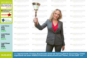 3.3: Agenturchefin Christina Brandenstein läutet die Opening Bell für Donnerstag. Zuletzt organisierte sie einen ASB EU-Financial-Literacy-Event zum Thema „Fit fürs Geld“ http: www.brandensteincom.at http: www.schuldenberatung.at 2.3: Sigrun Reininghaus läutet die Opening Bell für Mittwoch. Die langjährige ORF-Journalistin und frühere EU-Korrespondentin arbeitet jetzt als Moderatorin und Medientrainerin http: www.sigrunreininghaus.at 1.3: Patrick Minar mit der Opening Bell für Dienstag. Seine auf Ligitation PR spezialisierte Agentur Schneider | Minar | Jenewein Consulting eröffnete vor kurzem ein Office in London http: www.smj.at 29.2: Jubiläum: Martina Malyar , SPÖ-Bezirksvorsteherin von Wien Alsergrund, l&aum... » Weiterlesen