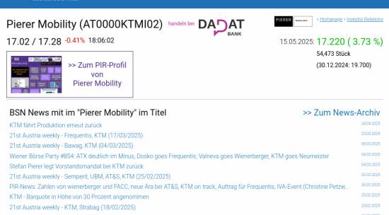 Pierer Mobility am 15.5. 3,73%, Volumen 190% normaler Tage