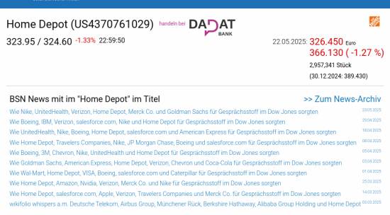 Home Depot am 22.5. -1,27%, Volumen 83% normaler Tage