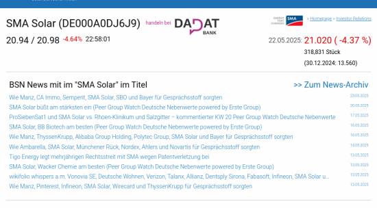 SMA Solar am 22.5. -4,37%, Volumen 106% normaler Tage