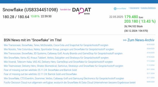 Snowflake am 22.5. 13,43%, Volumen 475% normaler Tage