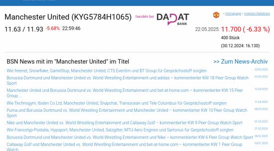 Manchester United am 22.5. -6,33%, Volumen 403% normaler Tage