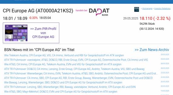 CPI Europe AG am 29.5. -2,32%, Volumen 87% normaler Tage