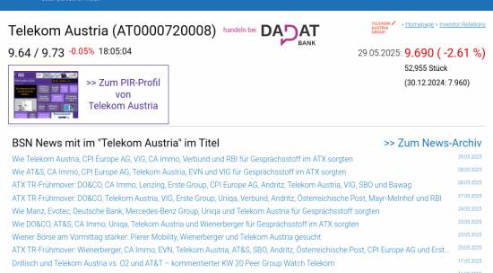 Telekom Austria am 29.5. -2,61%, Volumen 70% normaler Tage