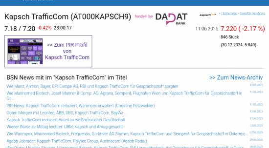 Kapsch TrafficCom am 11.6. -2,17%, Volumen 14% normaler Tage