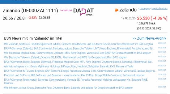 Zalando am 19.6. -4,36%, Volumen 117% normaler Tage