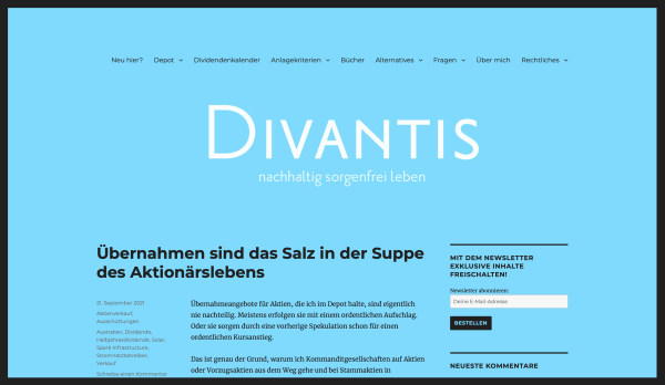 Ich bin Ben. Ich beschreibe seit Januar 2017 auf Divantis, wie ich mit meinem nachhaltigen Dividendendepot langfristig anlege und Erträge erziele. Alle meine Beiträge sind real und mit echtem Geld. Ich belege das mit den Originalabrechnungen meiner Depotbanken. Mein Motto und mein Ziel lautet „nachhaltig sorgenfrei leben“.