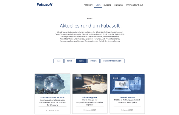 Als börsennotiertes Unternehmen und einer der führenden Softwarehersteller und Cloud-Dienstleister in Europa gibt Fabasoft im News-Bereich Einblicke in die digitale Welt. Schwerpunkte sind Informationen über Innovationen, Besonderheiten des Produktportfolios und Details zu speziellen Features. Auch Präsentationen zu Forschungsschwerpunkten und Events zeigen die Vielfalt des Unternehmens.