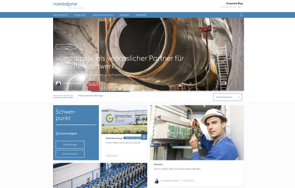 Als weltweit führender Stahl- und Technologiekonzern setzt die voestalpine AG mit dem Corporate Blog auf Themen rund um die Schwerpunkte Innovation, Mobilität, Energie, Engagement, Karriere und Events. Im Mittelpunkt stehen dabei immer die Geschichten der voestalpine Mitarbeiter, die Projekte sowie Produkte.