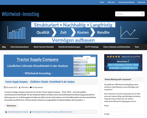 Whirlwind-Investing spiegelt mein Verständnis einer strukturierten und langfristigen Geldanlage wieder. Hierfür greife ich bevorzugt auf Aktien von Qualitätsunternehmen zurück, d.h. auf Unternehmen, welche profitabel wirtschaften, finanziell solide aufgestellt sind und ihre Umsätze und Gewinne langfristig, zuverlässig und stabil steigern.