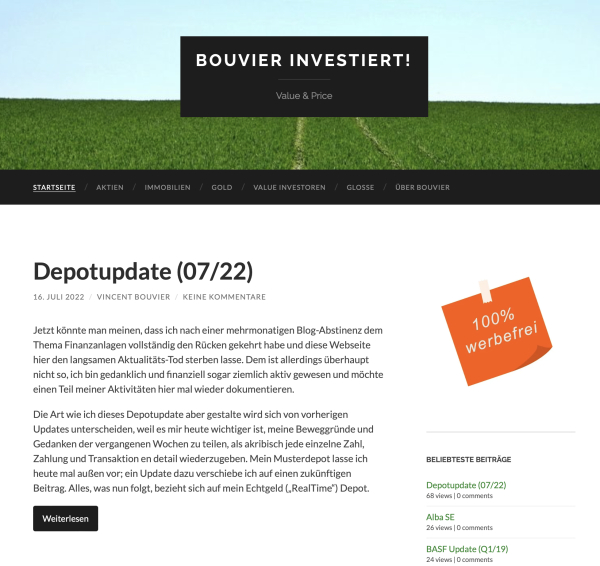 In diesem Blog möchte ich also über meine Erfahrungen berichten, meinem Fetisch für Unternehmensanalysen frönen, die Ansätze meiner Lieblings-Value-Investoren erörtern und im allgemeinen die inneren Werte von Investitionen bewerten. Das geht über den Aktienmarkt hinaus und betrifft aus der Sicht des Privatmannes und Hobbyanalysten auch Immobilien, Anleihen, Rohstoffe etc.