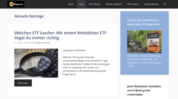 Bloggen ist die richtige Tätigkeit, wenn man gerne schreibt und mit dem Laptop arbeitet. Deshalb habe ich im Mai 2015 den Finanzblog ETF-Blog.com gegründet. Über ETFs deshalb, weil ich 2013/2014 meine ersten Berührungen mit Exchange Traded Funds (ETFs) hatte und sofort Feuer und Flamme war. Ich brannte und brenne förmlich für dieses Thema. Warum? Weil ETFs eine einfach zu verstehende, flexible und kostengünstige Form der Geldanlage sind – mit einer eingebauten Risikostreuung.