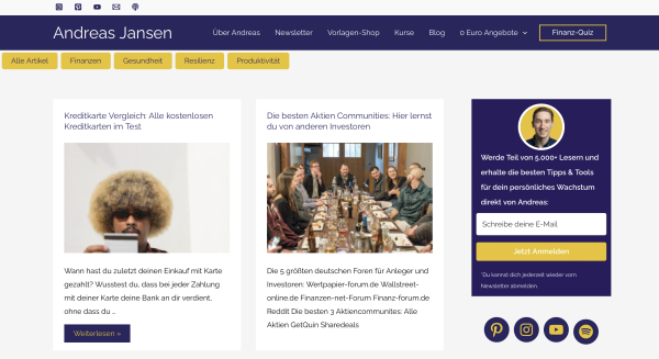 Ich bin Andreas und möchte dir helfen, dass du dein „Persönliches Wachstum“ förderst. Persönliches Wachstum bedeutet für mich, dir in den Bereichen Finanzen, Gesundheit, Resilienz und Produktivität zu helfen erfolgreicher zu werden.