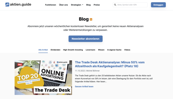 Mit dem aktien.guide wollen wir einen Beitrag dazu leisten, die Aktienkultur im DACH-Raum voranzubringen. Dir als Privatinvestor wollen wir alle Tools an die Hand zu geben, die Du brauchst, um die Risiken zu beherrschen und langfristig eine überdurchschnittlich gute Rendite auf Dein investiertes Kapital zu erzielen.