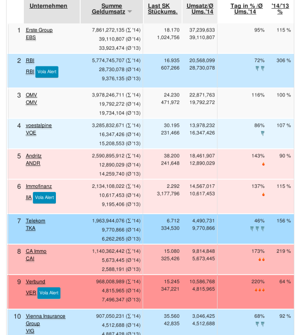 Das hat man heute zur Telekom gelesen, heisst andersrum: Nur noch knapp 12 Prozent sind in Streubesitz. Aktuell hat die Telekom Austria einen Free Float Faktor von 0,3 Prozent und ist noch mit 2,49% im ATX berücksichtigt. Sollte der Streubesitz unter 10 Prozent fallen, so müsste wohl ein Faktor von 0,1 angesetzt werden und dann würde es nach Kapitalisierung schon recht eng. Bei den Umsätzen (siehe unten) ist die Telekom heuer auf Rang 7. Da ist also noch viel Platz.