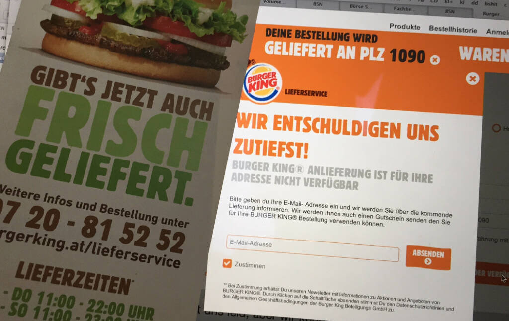 In meinem Briefkasten lag heute ein Burger-King-Flyer, der den neuen Lieferservice anhyped. Ich solle doch gleich bestellen. Gut, ich werfe den Computer an, geb die Bestell-URL ein, dann brav meine Adresse, dann die Enttäuschung: "Wir entschuldigen uns zutiefst! Burger King ist für Ihre Adresse nicht verfügbar"