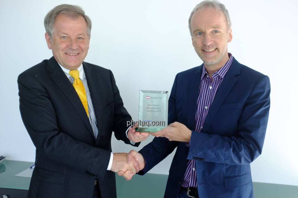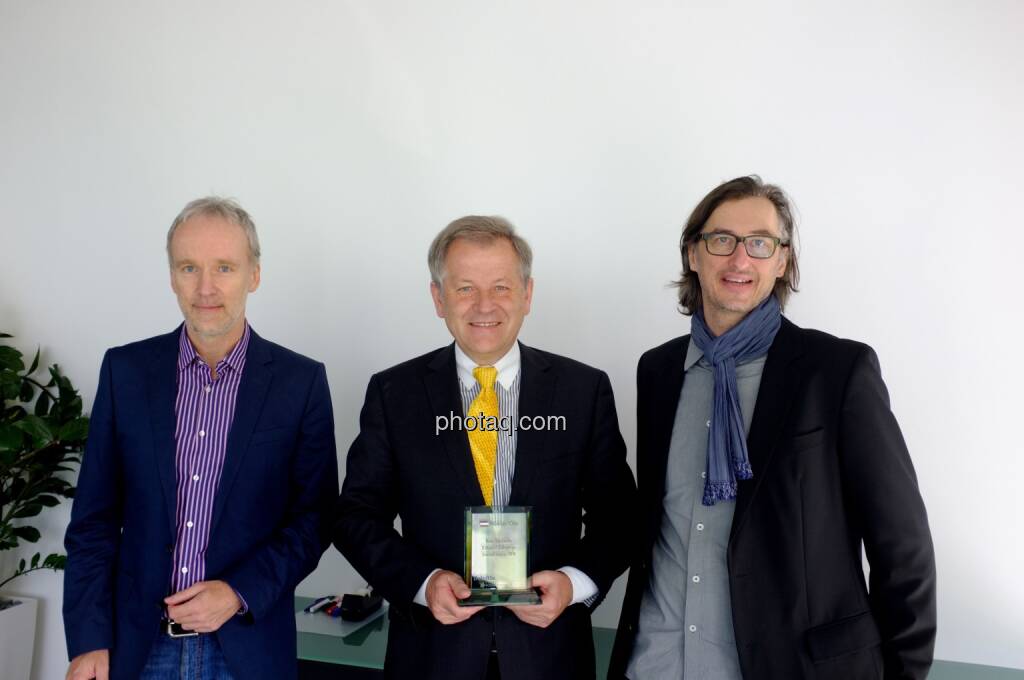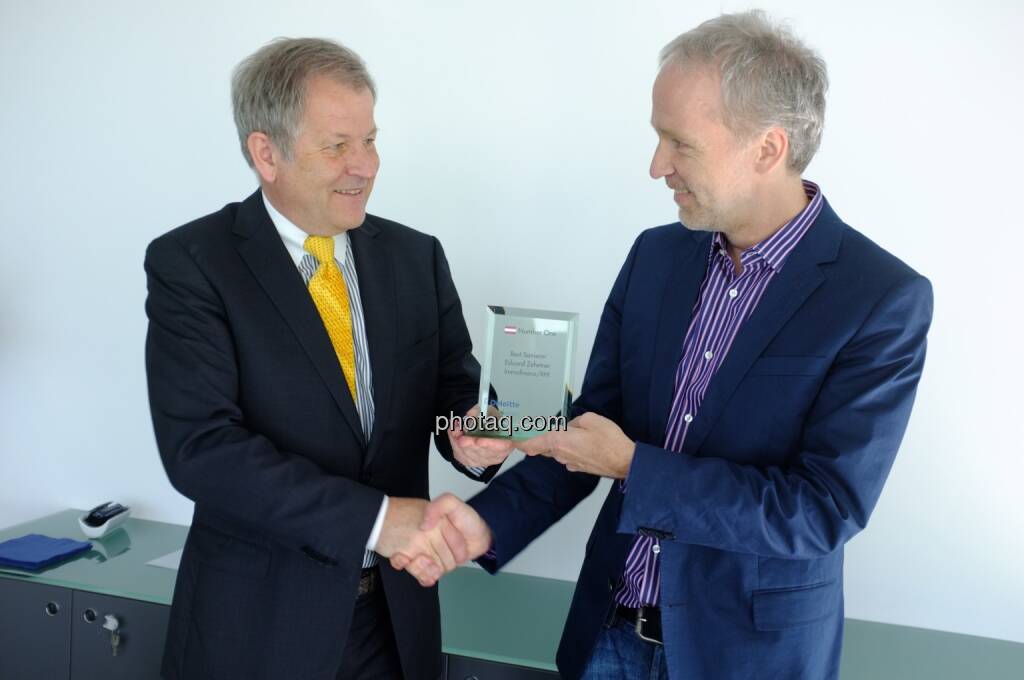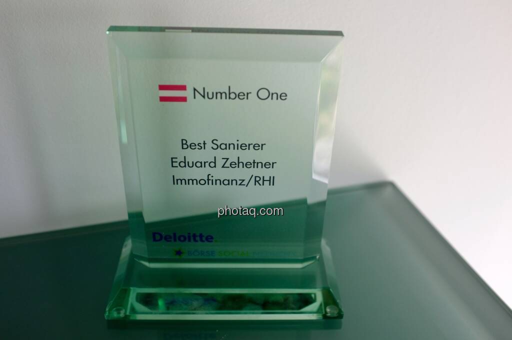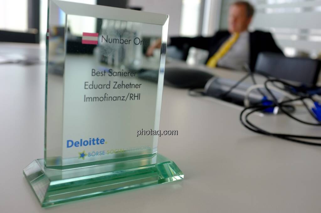 Mein Co. Josef Chladek und ich übergaben heute Vormittag den „Number One Award" an Noch-Immofinanz- und Ex-RHI-Vorstand Eduard Zehetner, dessen Sanierungen kumuliert eine Verhundertfachung des eingesetzten Kapitals brachten, an seinem letzten Immofinanz-Arbeitstag persönlich. Stolz! Der halbstündige Smalltalk war für mich sehr emotional. Und das Bild hat Symbolik: Der Mann hatte stets Handschlagqualität. Danke! Wohl auch im Namen von tausenden Privatanlegern. "Z" wird fehlen.
