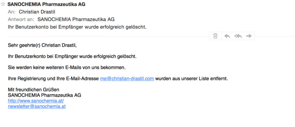 Ich meine: ... und zwar ein persönliches Alzheimer-Problem bei Sanochemia, durchaus auch bekannt wegen Alzheimer-Forschung. Ich kann mich nämlich nicht erinnern, den Newsletter abbestellt zu haben. Hoffentlich hat mich das Unternehmen nicht von sich aus entfernt. Glaub ich aber nicht, ich war ja nie böse und das Office ist wie meins im 9. Bezirk ...