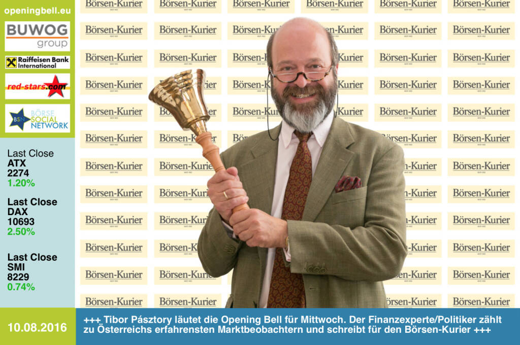 10.8.: Tibor Pásztory läutet die Opening Bell für Mittwoch. Der Finanzexperte/Politiker zählt zu Österreichs erfahrensten Marktbeobachtern und schreibt für den Börsen-Kurier http://www.boersen-kurier.at
