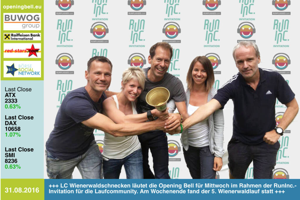 31.8.: Die Macher des LC Wienerwaldschnecken (Andreas Schweighofer, Lilian Kuster, Thomas Baucek und Beate Baucek) sowie Vereinsmitglied Christian Drastil läuten die Opening Bell für Mittwoch im Rahmen der RunInc.-Invitation für die Laufcommunity. Am Wochenende fand der 5. Wienerwaldlauf statt. Ergebnisse und mehr als 1000 Bilder vom Event unter http://www.wienerwaldlauf.at Runplugged-Bilder unter http://www.photaq.com/page/index/2687 http://www.runinc.at