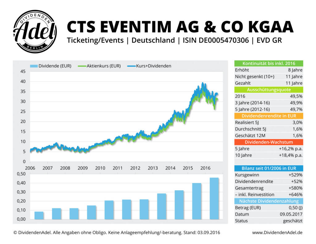 Ein lohnendes Geschäft, wie nicht zuletzt der Blick auf die Ausschüttungs-Historie von CTS Eventim beweist: Seit elf Jahren zahlt die in München und Bremen ansässige Firma eine Dividende und seitdem gab es keine einzige Kürzung, sondern zehn Anhebungen – zuletzt sogar acht in Serie, wobei es pro Jahr im Schnitt um rund 18% nach oben ging.