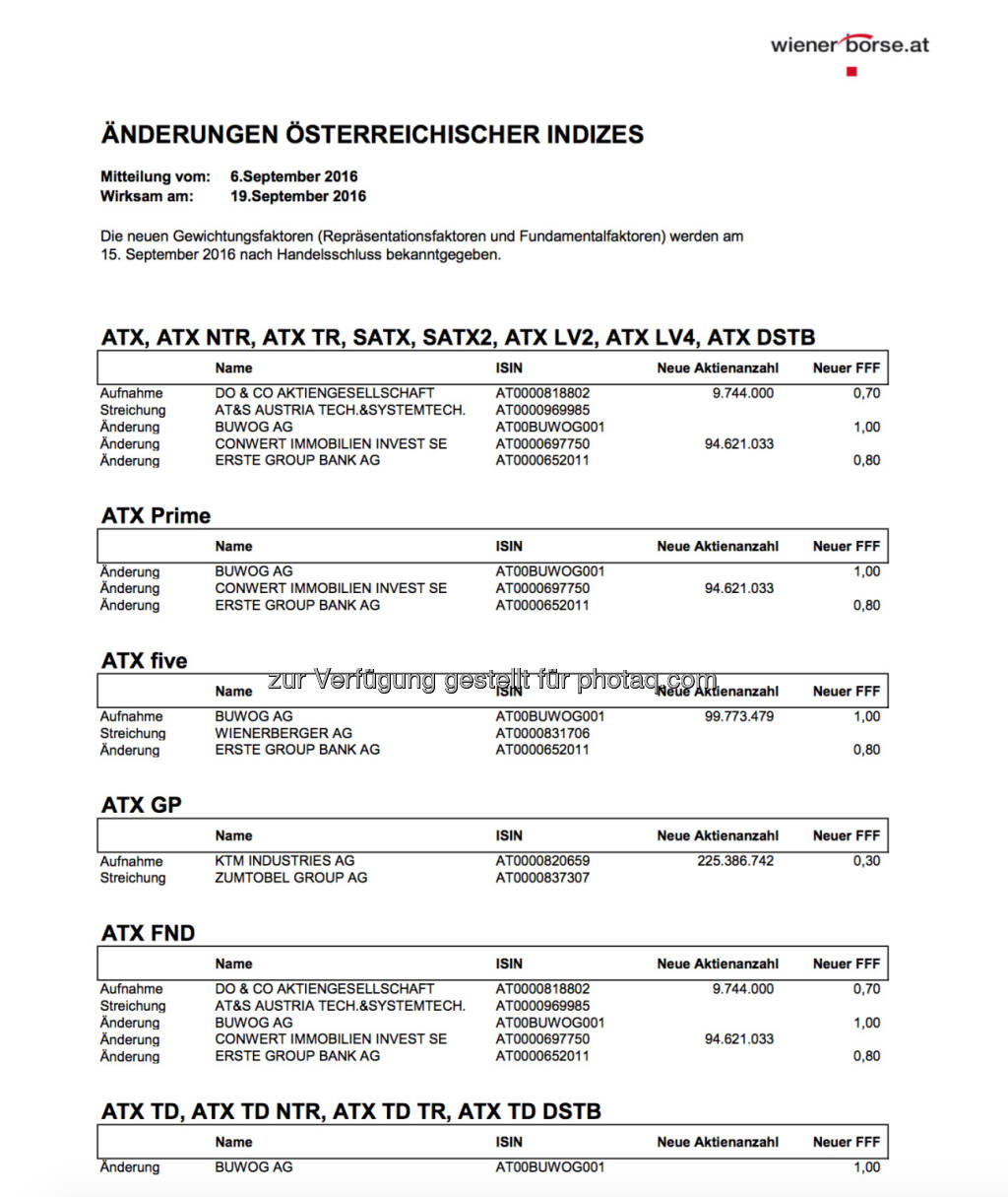 "Liebe Leser! Die Wiener Börse hat die ATX-Beobachtungsliste 8/2016 veröffentlicht. Diese umfasst die Gesamtbörseumsätze 9/2015 bis 8/2016 der prime market-Werte. Sie ist massgeblich für die Umstellung per September-Verfall. Erstmals wurde die VWAP-Methode angewandt.